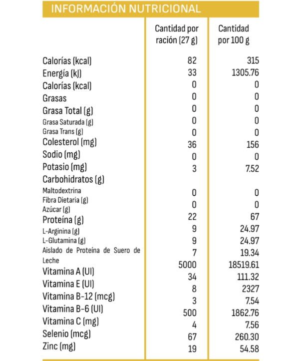 - Contiene arginina y glutamina, aminoácidos clave en la respuesta inmunológica y en la regeneración celular.